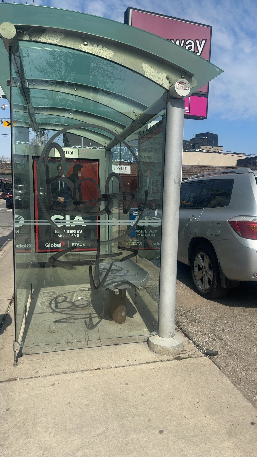 A TTC transit shelter on Sackville Street has glass panels on both sides heavily tagged with black graffiti and a metal canopy roof covered in dirt and grime. The shelter structure is intact but requires graffiti removal and cleaning to restore its condition.