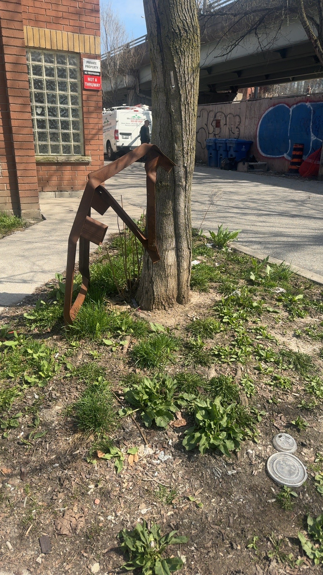 One large piece of corroded metal machinery is leaning against a tree on the sidewalk, showing significant rust and deterioration with weeds growing around its base. The object creates a tripping hazard and visual blight, and appears to have been abandoned rather than fallen from installed infrastructure. Three nearby litter bins are serviced five times weekly.
