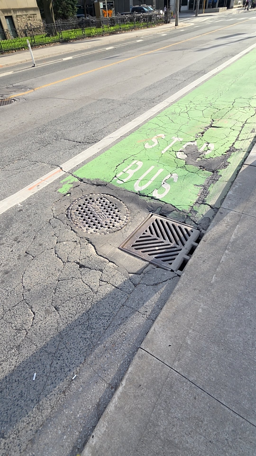 The bike lane at 487 Jarvis Street has extensive cracking and lifting around a sinking catch basin and storm drain, with radiating fractures and split green paint creating trip and puncture hazards for cyclists. The reporter notes the resulting bump could cause a serious accident if hit at speed. The deterioration appears caused by ground settlement or utility infrastructure work beneath the lane.