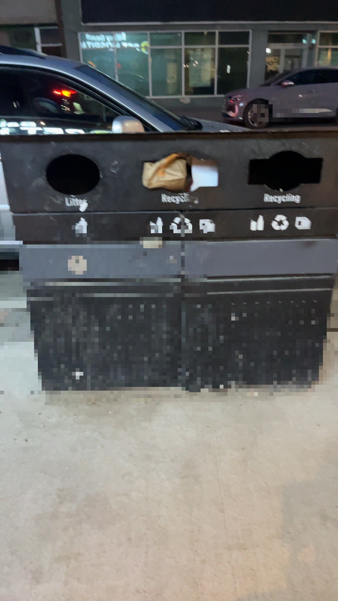 A multi-compartment recycling/waste bin on the commercial sidewalk has two of three compartment openings damaged, with one showing torn/missing material and another showing structural damage to the slot. A crumpled paper bag is protruding from the middle compartment, preventing proper waste sorting and creating a minor snag hazard. The bin is located among three nearby litter bins serviced seven times weekly.
