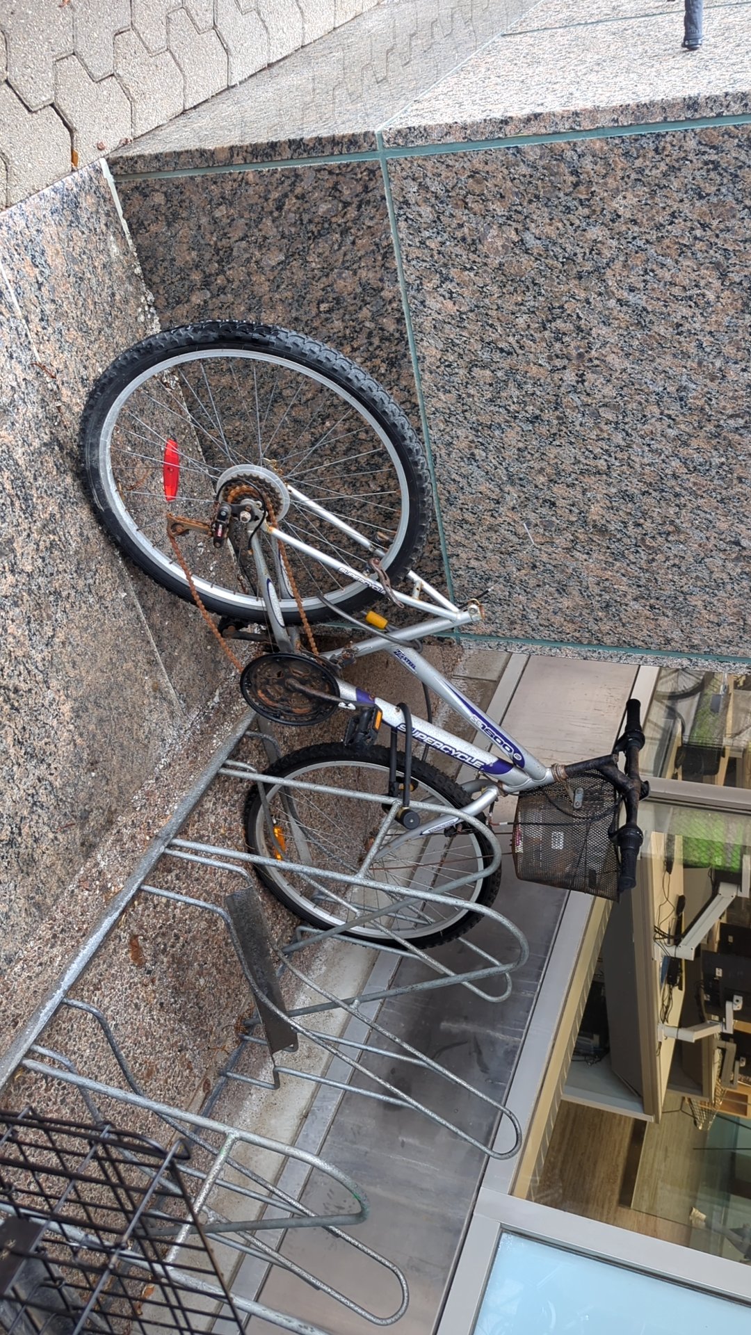 One abandoned bicycle in deteriorated condition is leaning against a concrete wall on the sidewalk behind North York Library. The bike shows visible rust, dust accumulation, a worn chain, and signs of prolonged neglect, obstructing sidewalk space. According to the reporter, the bicycle has been in place for over a year.