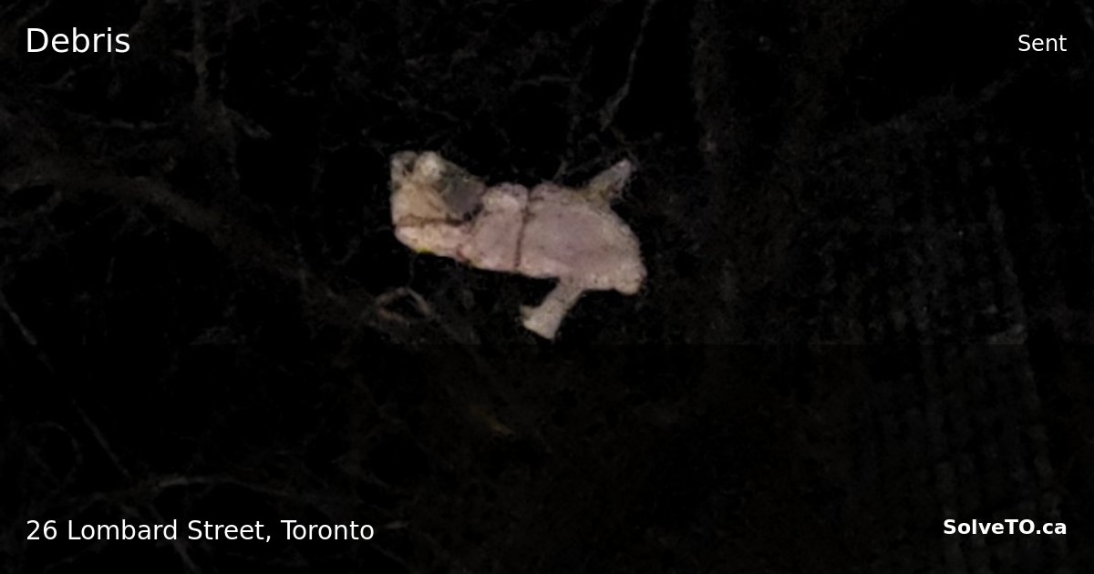 A tan/beige fabric bag is caught in tree branches above street level at 26 Lombard Street. The debris is suspended in the branches and does not block ground-level traffic, but remains visible tangled in the vegetation. Three litter bins are located nearby on the street.