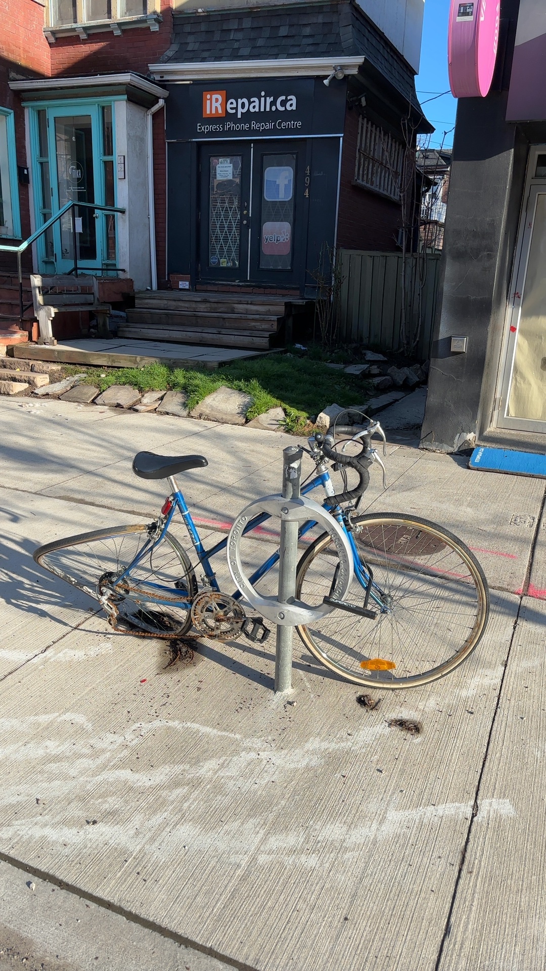 One abandoned blue and white bicycle, locked to a public bike rack on the north side of College Street, is rendering the rack unusable for other cyclists. The bicycle shows rust, a deteriorated chain, and dust accumulation indicating long-term neglect.