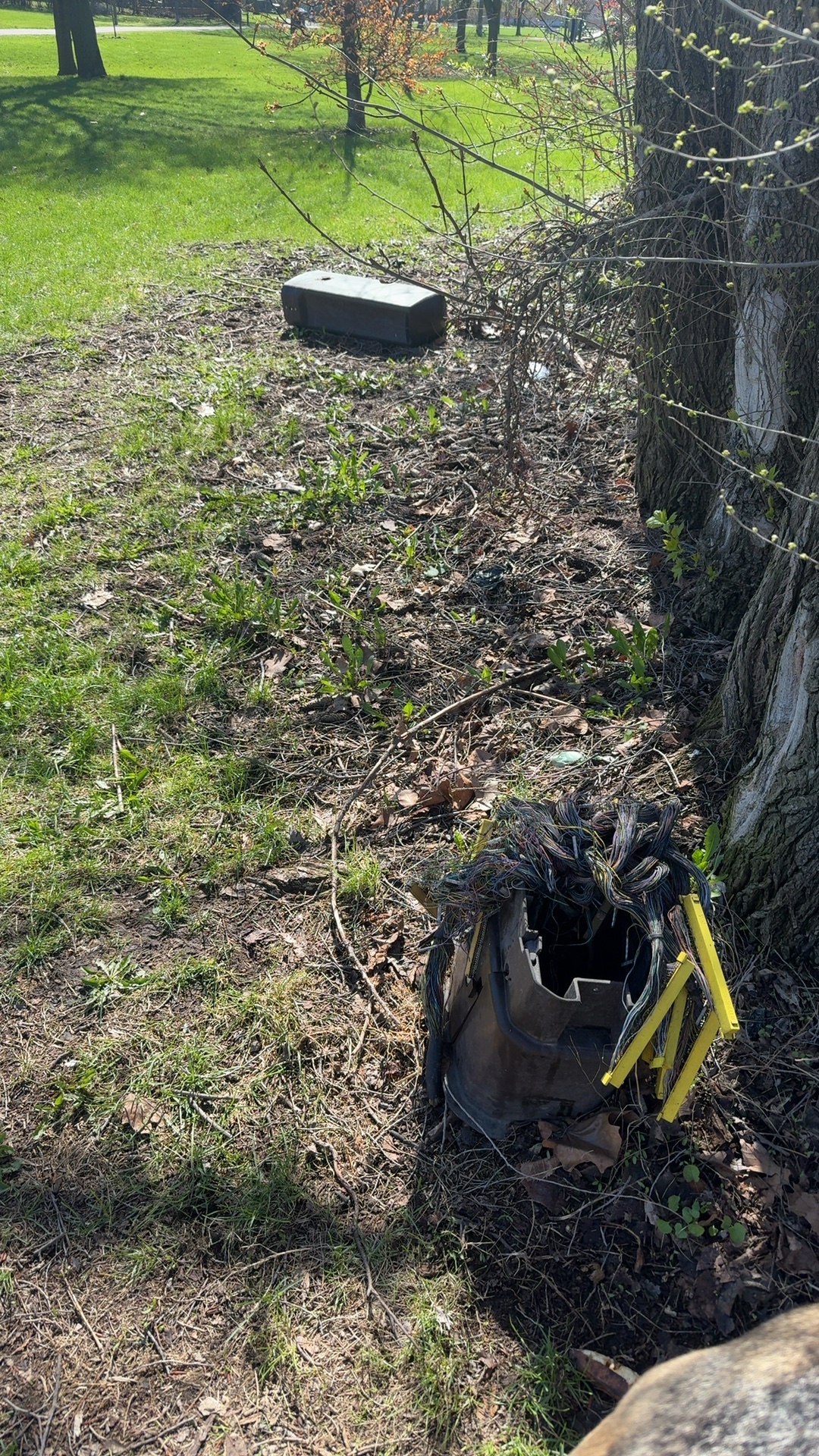 One abandoned bicycle with yellow frame and black components is discarded in park vegetation near a wooden fence, showing heavy deterioration and visible damage. An additional black plastic storage container is also abandoned on the park ground among shrubs and mulch, contributing to litter in the park area.