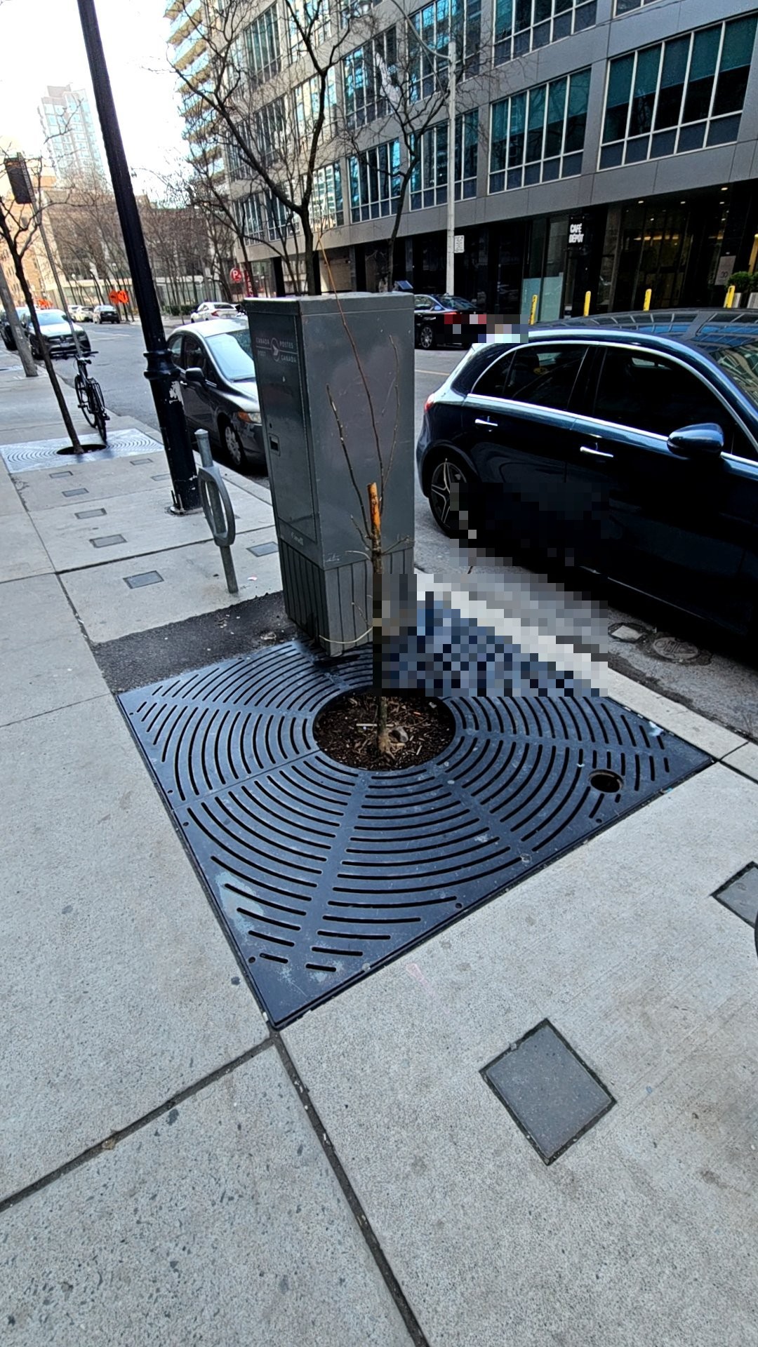 A rusted metal utility enclosure box is obstructing the sidewalk at this location, with visible corrosion on its exterior and a dead tree growing from its base. The obstruction creates a tripping hazard for pedestrians, and the deteriorating metal surface poses a potential contact hazard on this busy downtown sidewalk.