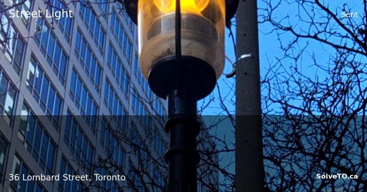 A street lamp on a black utility pole at 36 Lombard Street is illuminated during daytime hours, indicating a timer or sensor malfunction. The yellow/amber bulb remains on despite bright daylight, causing unnecessary energy consumption in a high-pedestrian area near two transit shelters.