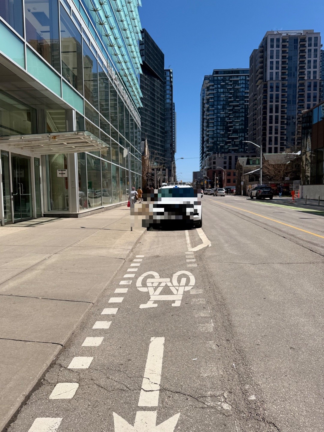 Two police vehicles—a white Ford SUV and a dark-coloured sedan—are parked directly on marked bike lanes on Shuter Street, fully blocking the cycling space and forcing cyclists into traffic or onto sidewalks. This is a recurring issue at this location. The obstruction eliminates the protection of dedicated bike infrastructure and creates collision hazards for cyclists.