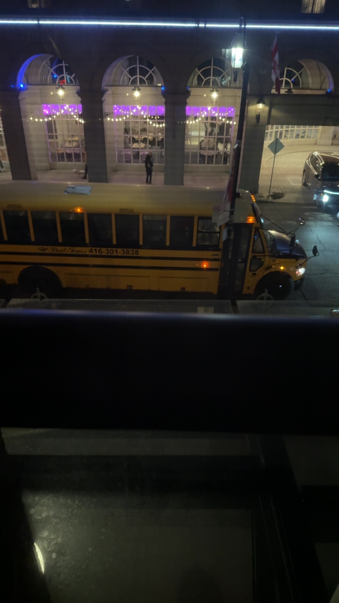 Idling school bus at 11:20pm. Company name Dual Trans.