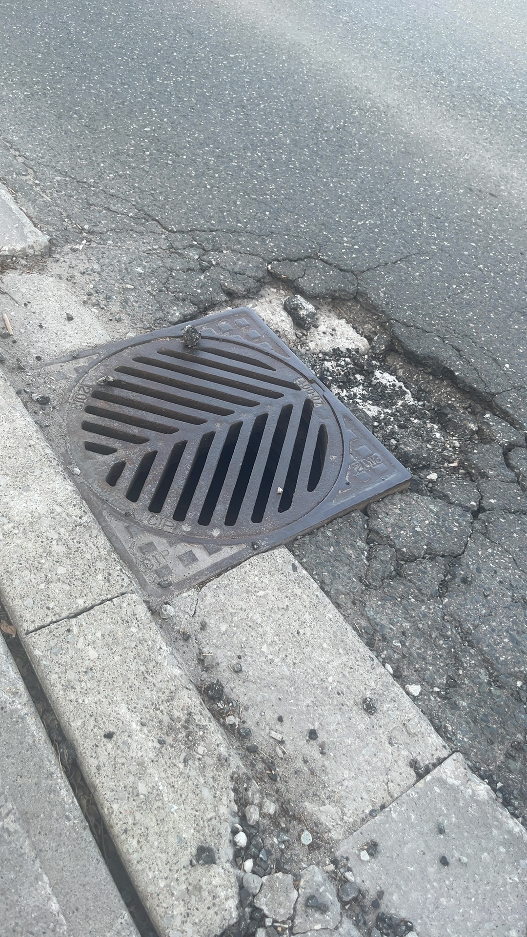 Sunken catch basin, broken asphalt