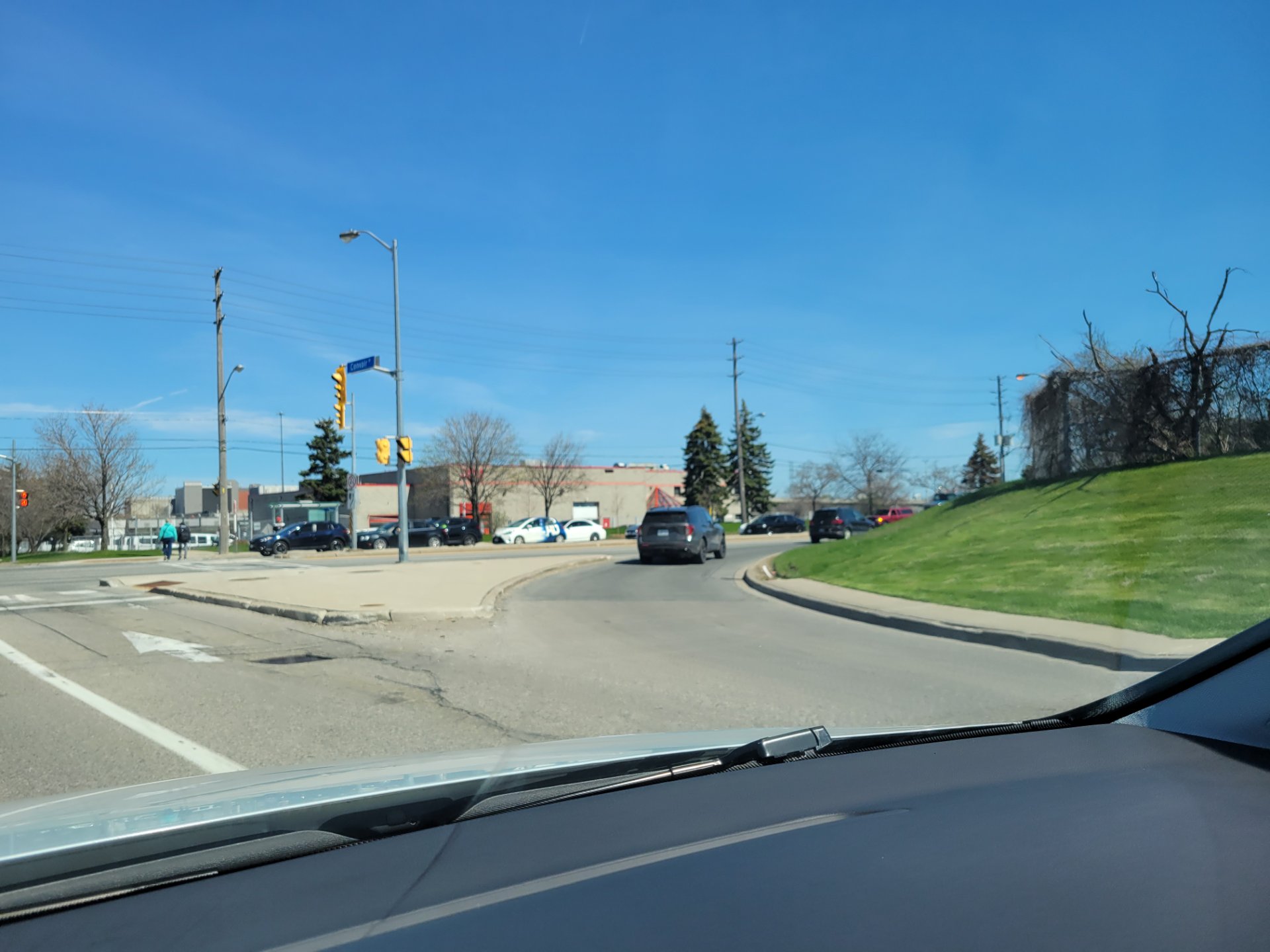 Yield sign is missing from the ramp entrance to Renforth Drive, leaving only a metal post visible at the ramp base. The ramp curves into the main intersection where a traffic signal is present, creating a safety hazard for vehicles entering without clear yield instructions.