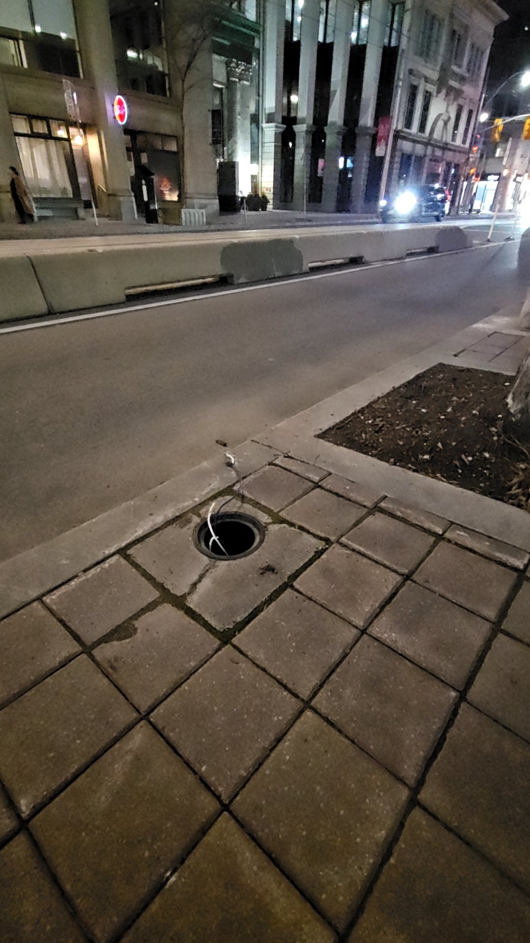 An uncovered maintenance hole approximately 12 inches in diameter is exposed in the downtown Toronto sidewalk with no cover or protective barrier, creating a tripping hazard for pedestrians. The opening reveals a drainage system access point and could allow debris to enter underground infrastructure. Two active road restrictions are in effect nearby.