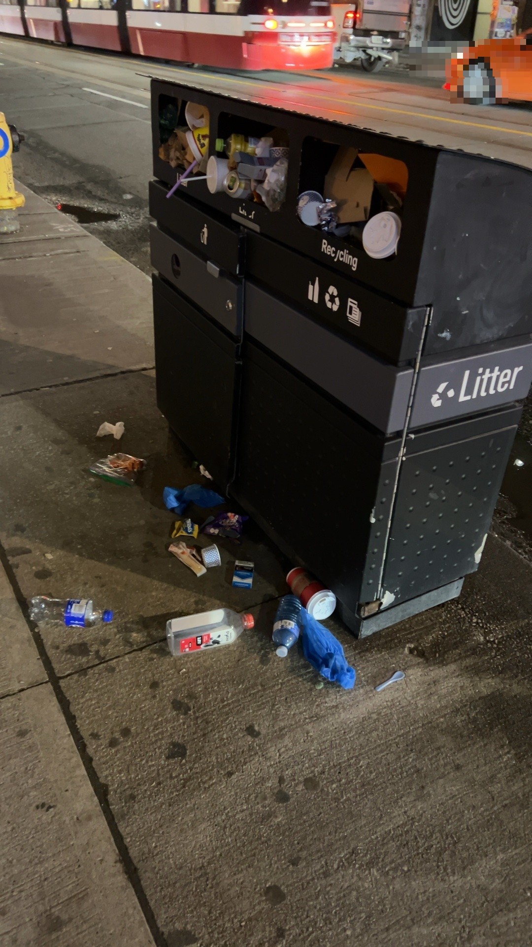 A public recycling/litter bin on the sidewalk is overflowing with garbage spilling onto the pavement, including bottles, cans, food waste, and plastic bags scattered around its base. Despite 3 litter bins nearby with weekly collection service, this bin requires immediate emptying.
