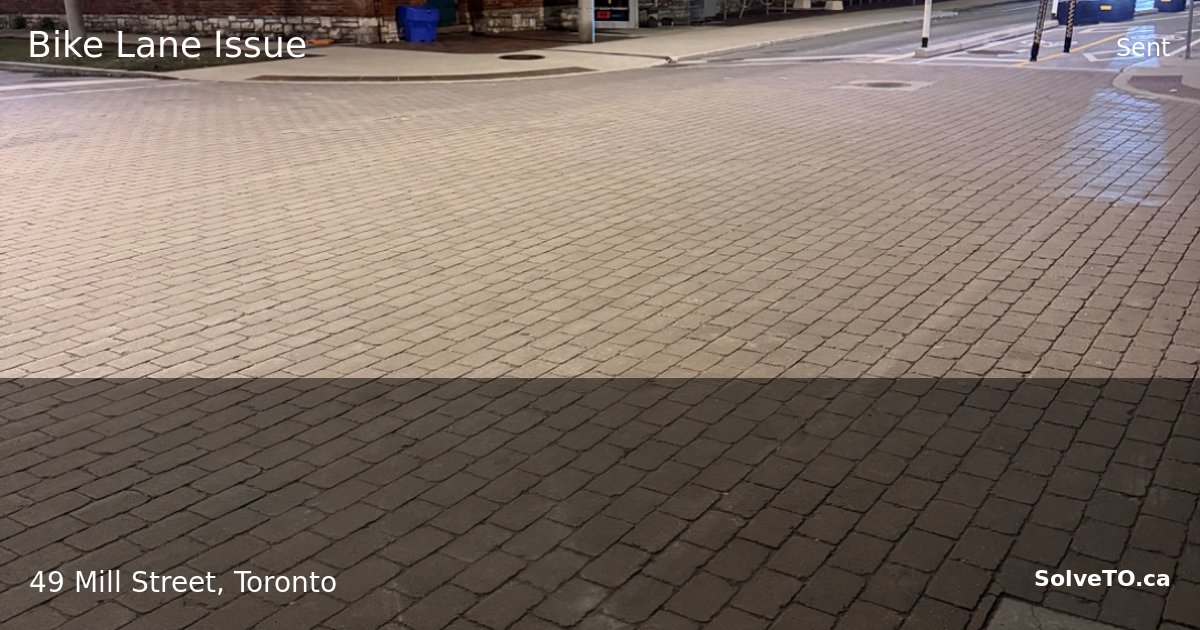 Bike lane and pedestrian crossing markings have worn away at the Mill Street paved plaza/intersection area and require repainting. One active road restriction is currently in effect nearby.