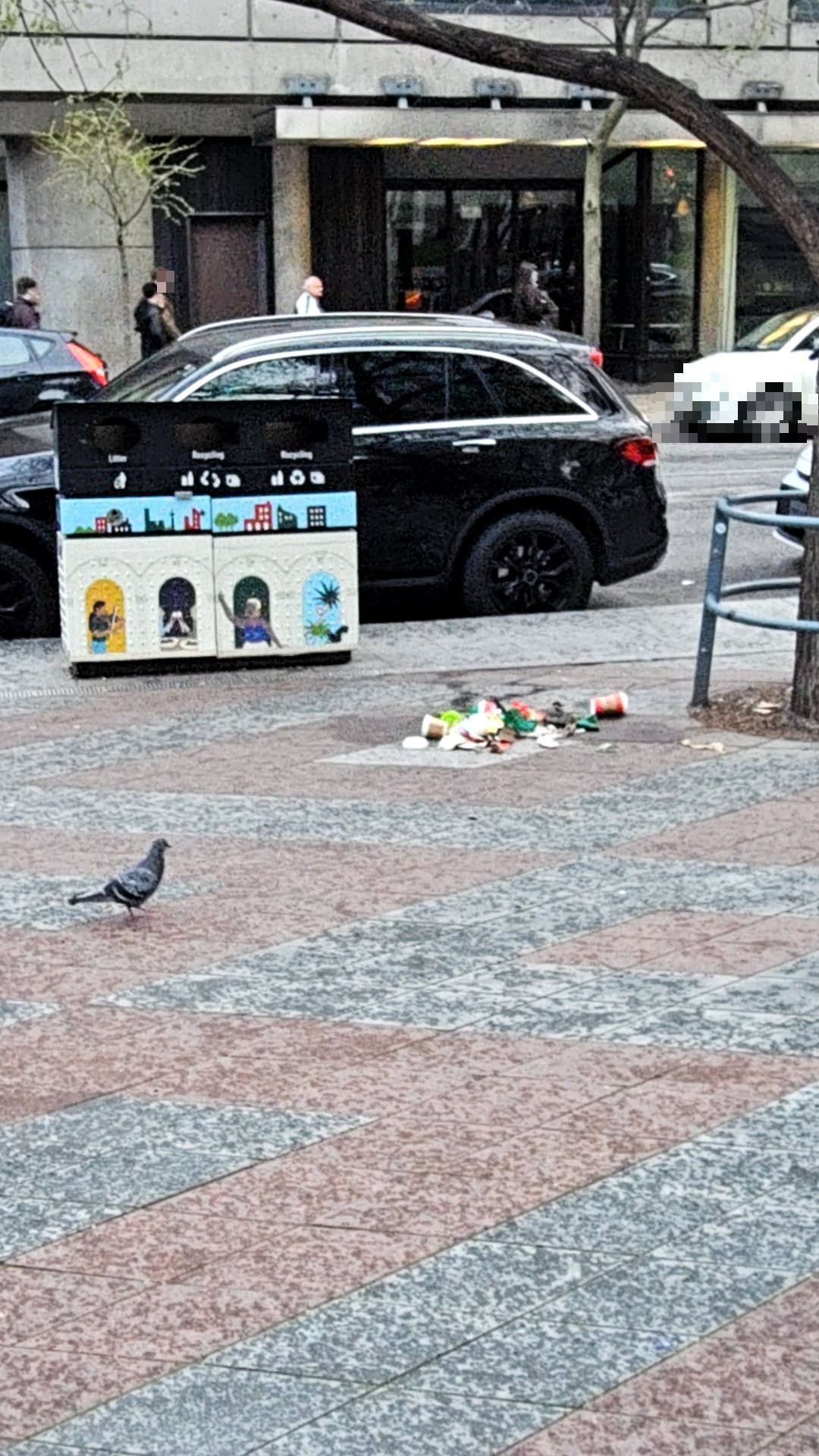 Scattered memorial items including flowers, candles, and papers along with a decorated cardboard box structure are creating a clutter hazard on the pedestrian area of the plaza near parked vehicles on Front Street East at King East.