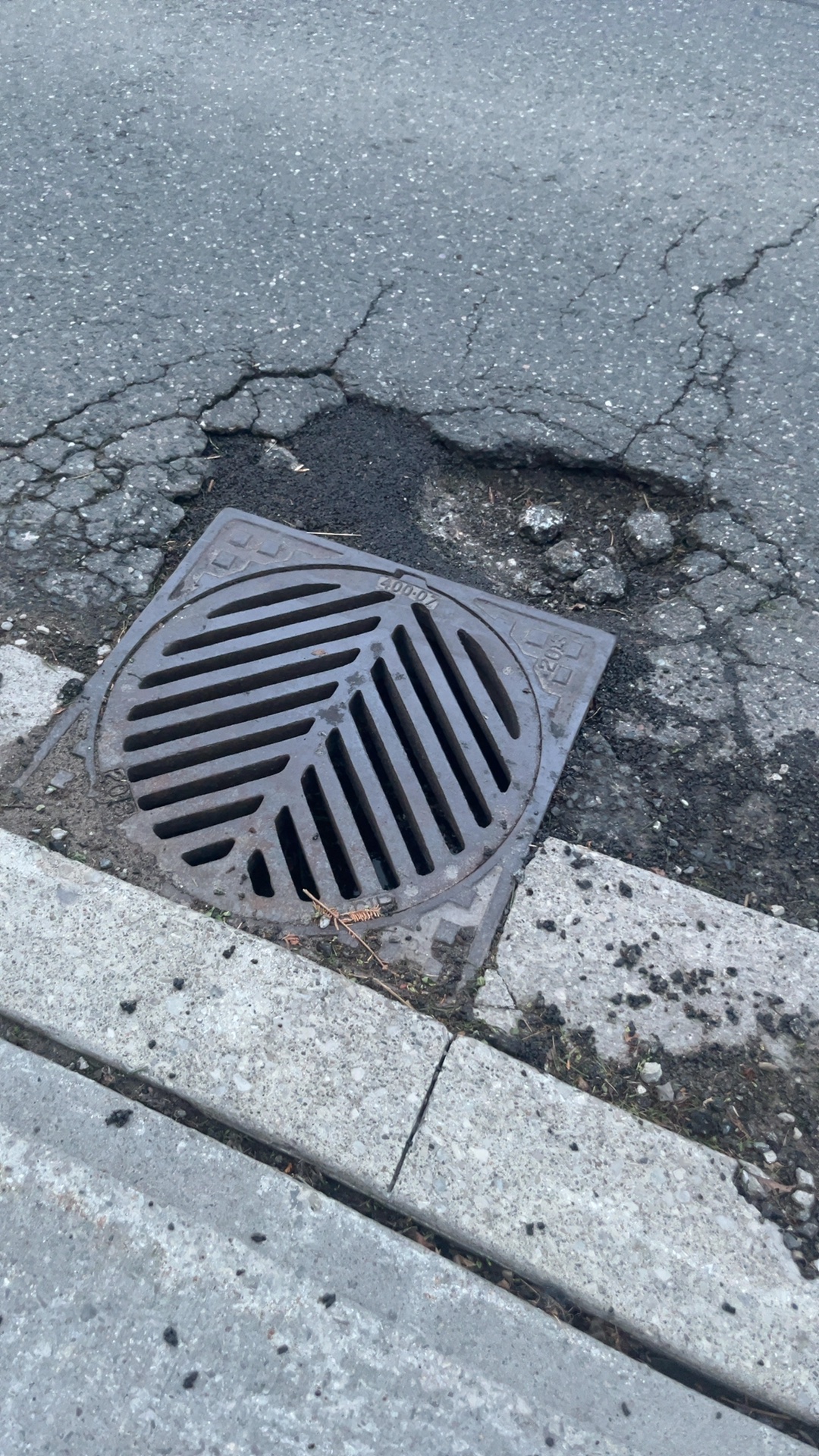 Blocked catch basin with damaged curb