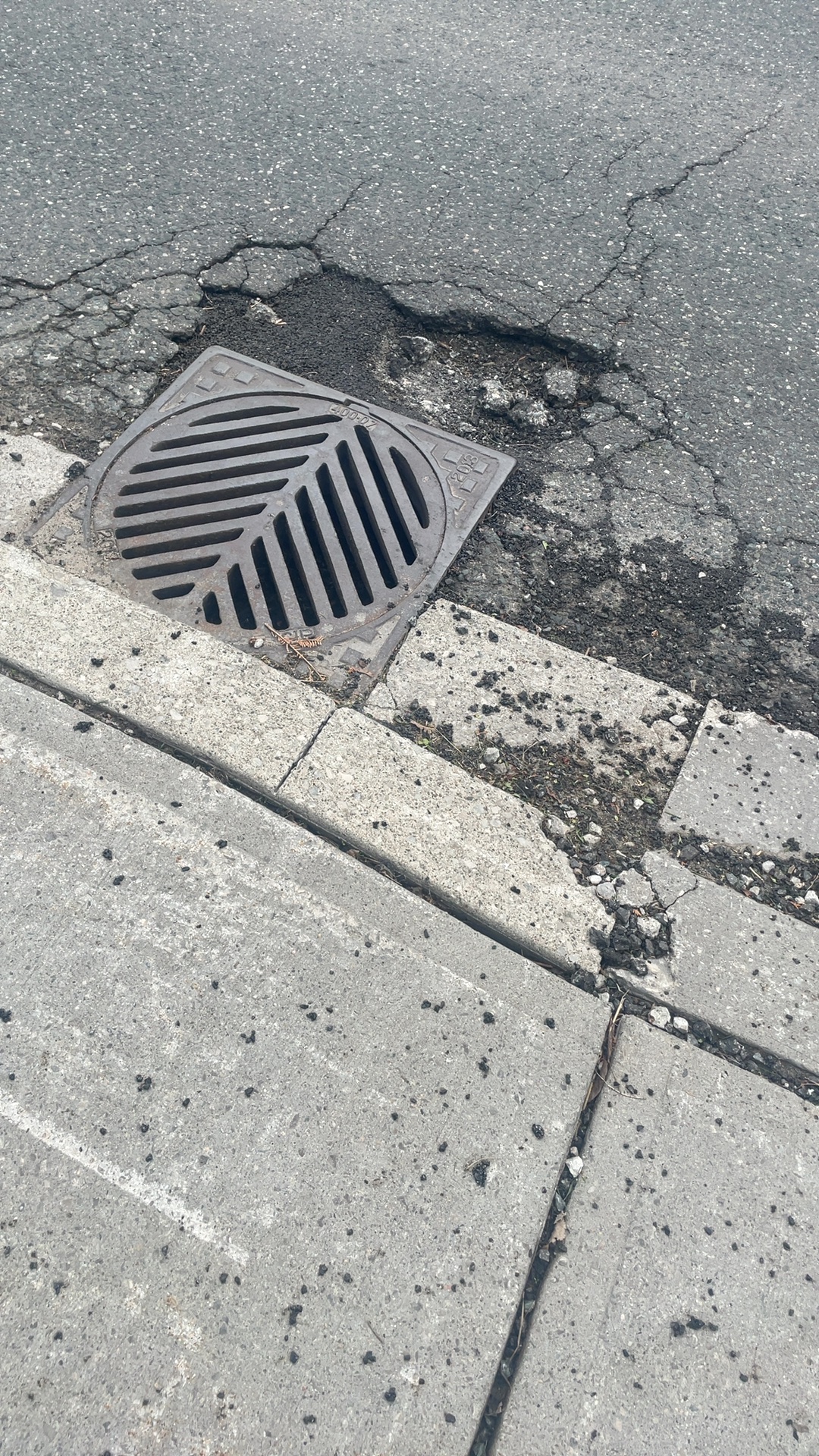 A cracked and deteriorated catch basin at the curb is causing fragmented pavement and settling around the drainage grate, creating a tripping hazard and reducing drainage function. The surrounding asphalt pavement is compromised and requires repair.