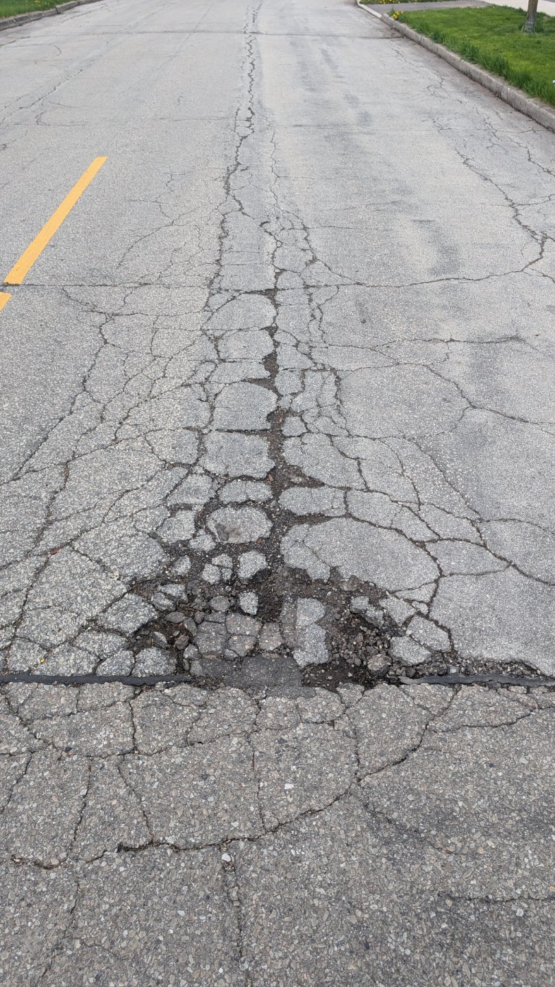 Extensive asphalt cracking and spalling across the road width with a large sinkhole forming along the center line on Arkley Crescent, exposing dark subsurface material and missing asphalt chunks. The road surface failure creates a trip and vehicle hazard, with aging infrastructure (catch basins averaging 70 years old) in the area likely contributing to the damage.