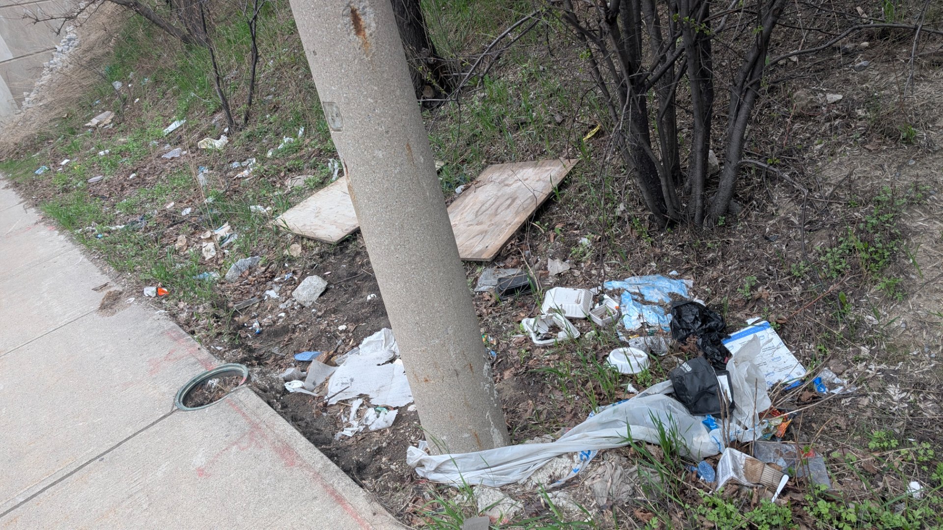 Illegal dumping on the embankment adjacent to the sidewalk at Martin Grove Road includes scattered bags, cardboard, wood planks, miscellaneous debris, and one bicycle wheel. A litter bin nearby is serviced five times weekly.
