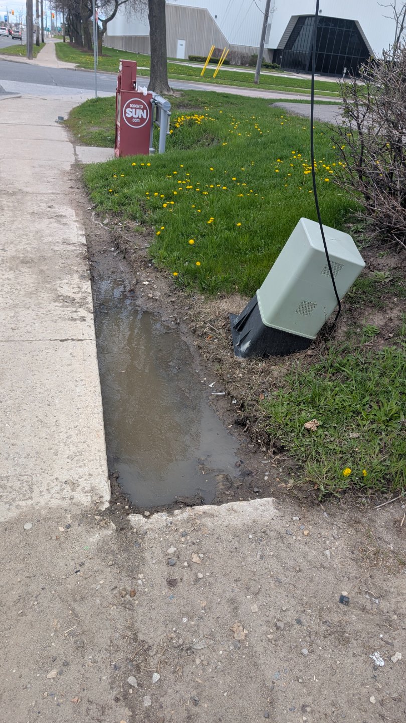 Standing water is pooling along the curb and property line next to the sidewalk, extending several feet, with a white utility box partially submerged; the nearby metal catch basin grate appears inadequate to handle the accumulated water.