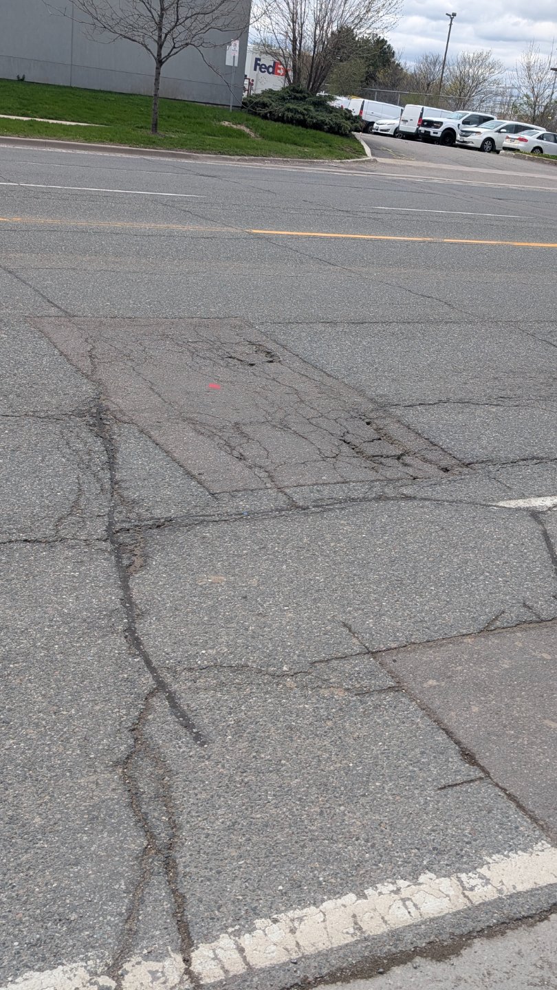 The parking lot on Martin Grove Road has extensive cracking and pavement deterioration with multiple linear cracks across the asphalt surface. The damage is located near aging utility infrastructure, including five catch basins averaging 67 years old.