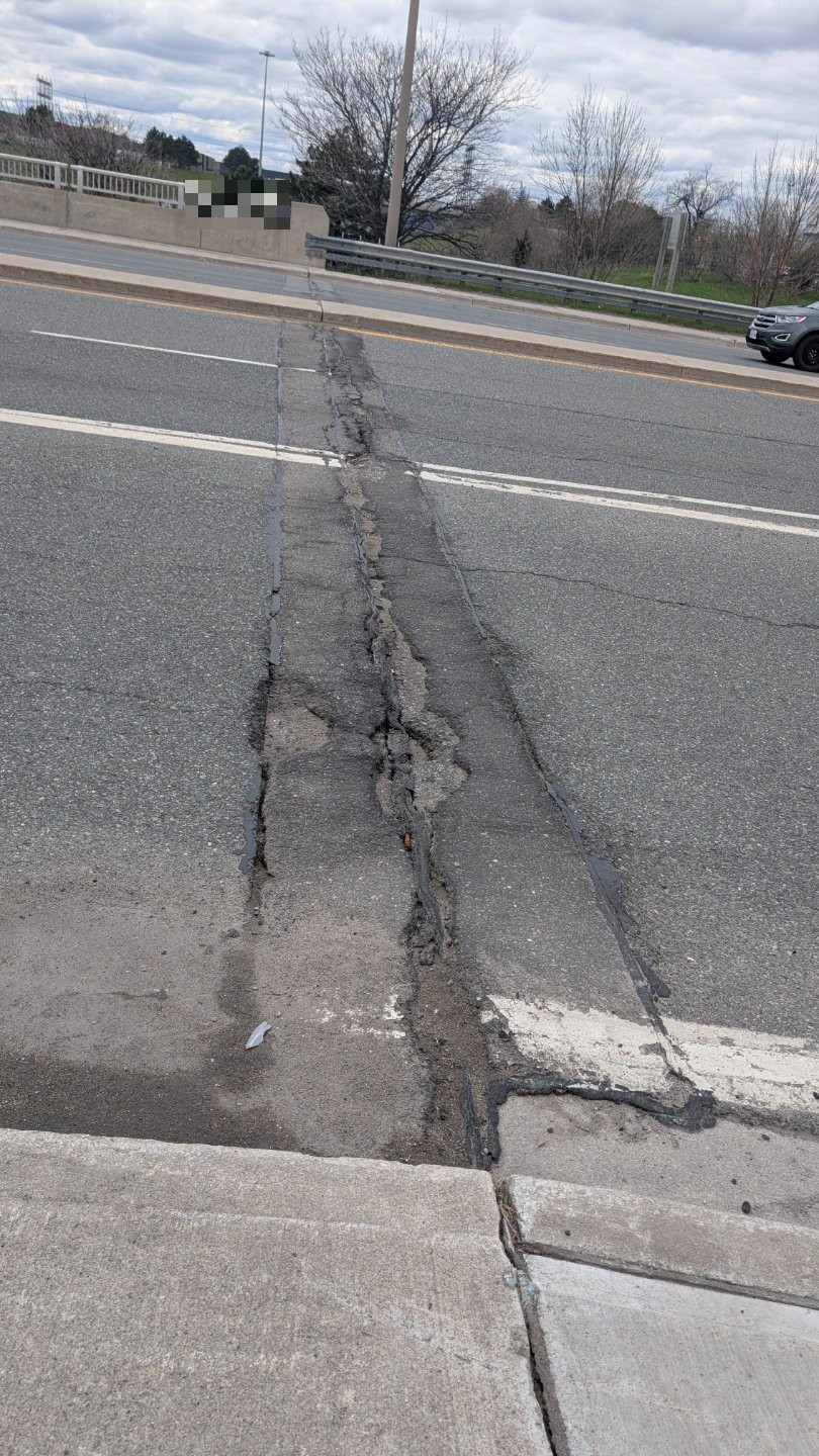 A long, deep longitudinal crack with jagged edges runs across Martin Grove Road, likely on a bridge or elevated section, with fractured and settling asphalt creating a hazard for vehicles and potential structural concern.