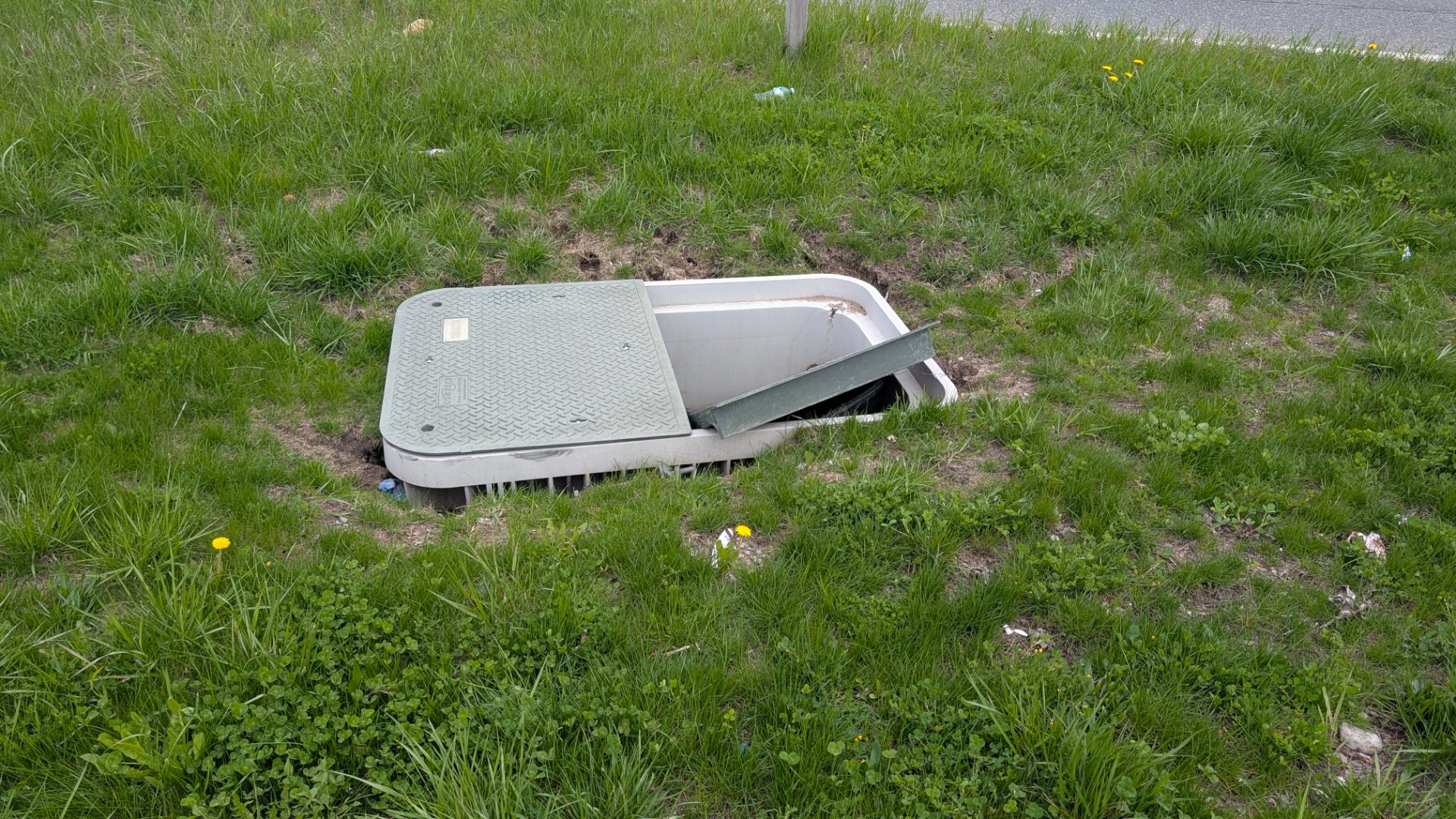 Open catch basin with grate removed and tilted on Martin Grove Road, exposing the basin opening and creating a fall hazard and tripping risk in a grassy area with foot traffic potential.