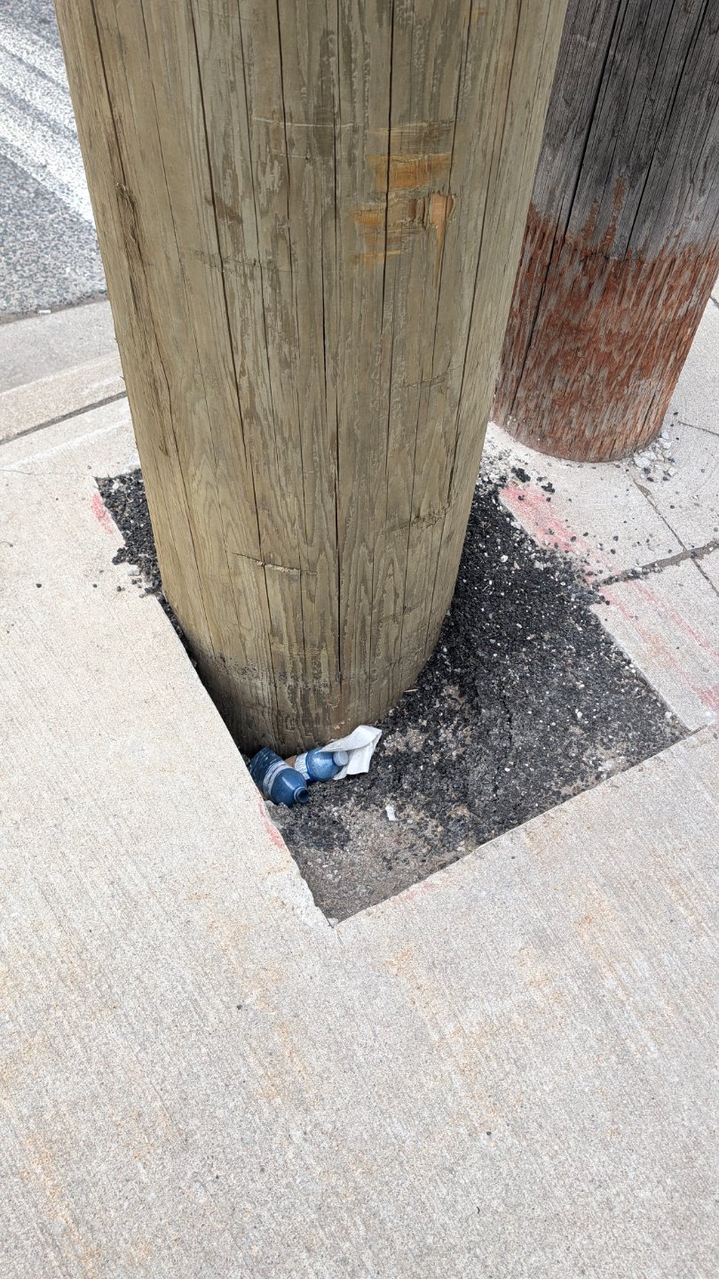 A wooden utility pole at Martin Grove and Belfield has a gap at its ground base with accumulated debris, exposing deteriorated foundation and creating a structural safety concern and tripping hazard on the sidewalk in a high-pedestrian area.