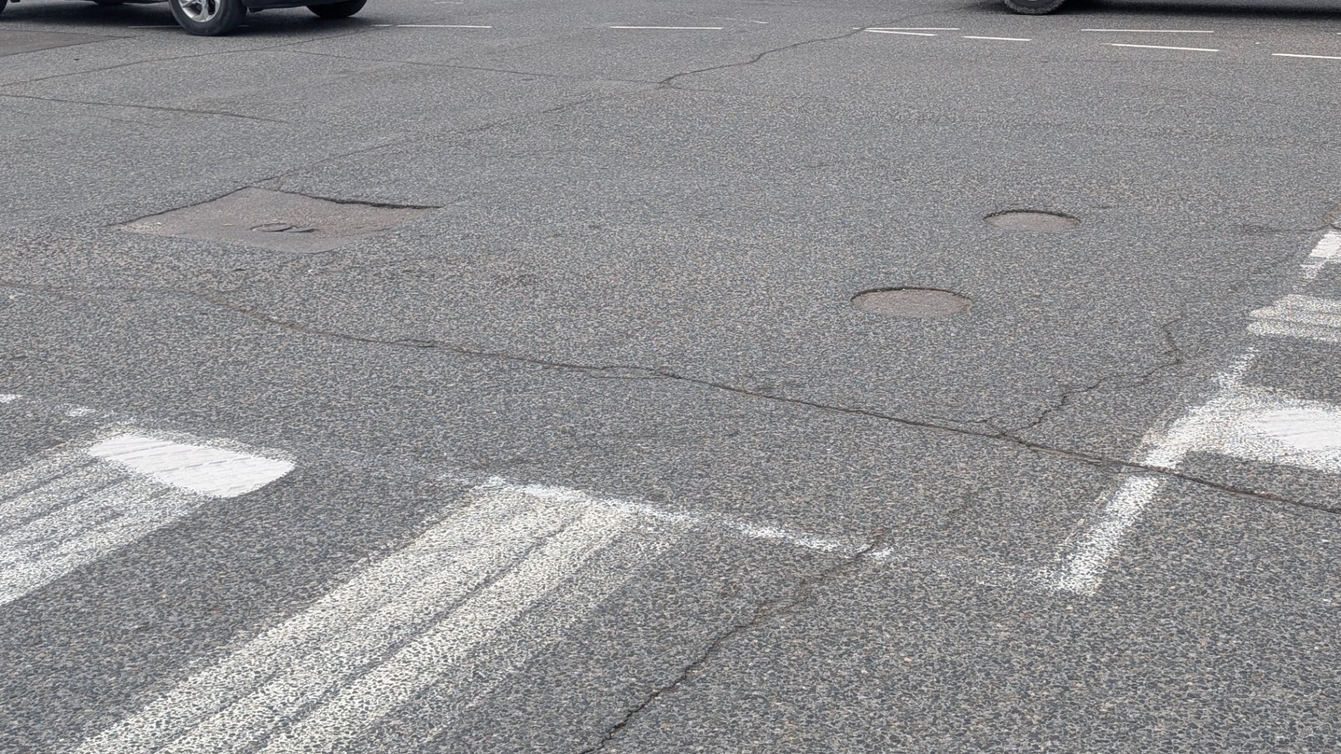The intersection of Martin Grove and Belfield shows multiple cracks, sunken asphalt patches, and faded crosswalk and lane markings across the surface. The underlying infrastructure—including catch basins averaging 65 years old—may be contributing to the deterioration.