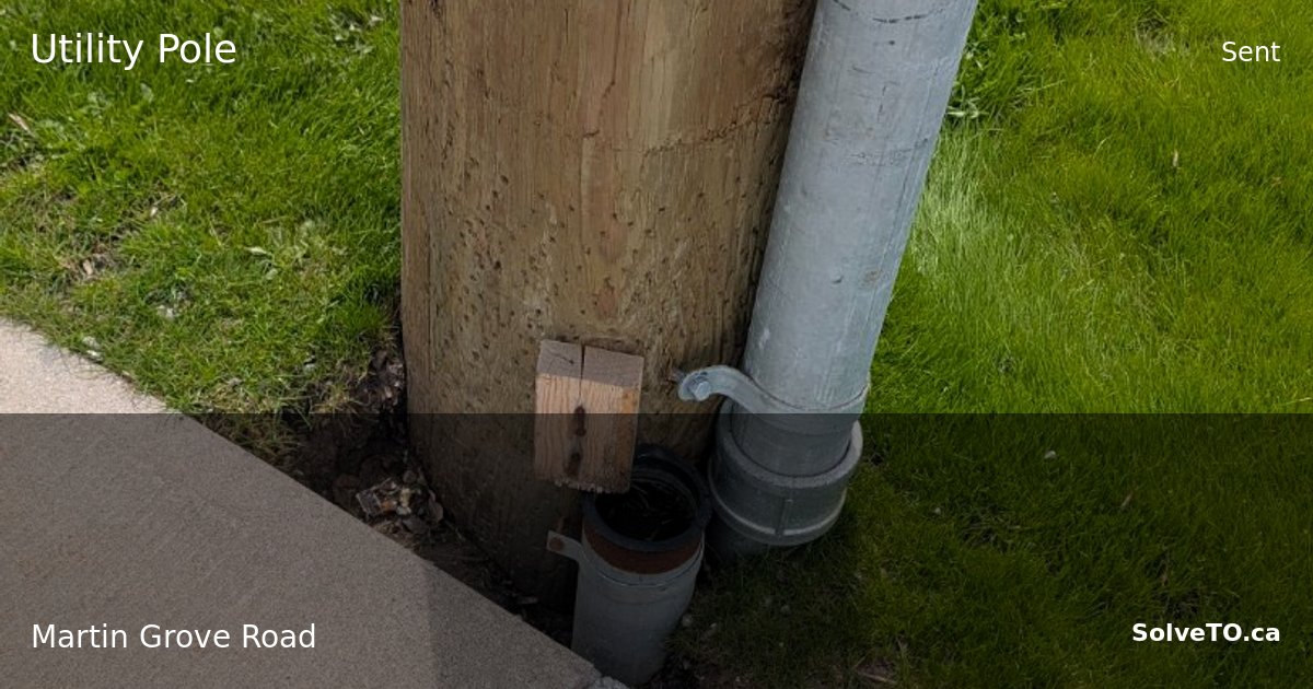 Wooden utility pole on Martin Grove Road has a deteriorating base with exposed connections; a metal pipe attachment shows weathered coupling hardware and wooden shims at ground level. The pole is in a high-pedestrian area near a traffic signal and transit shelters.