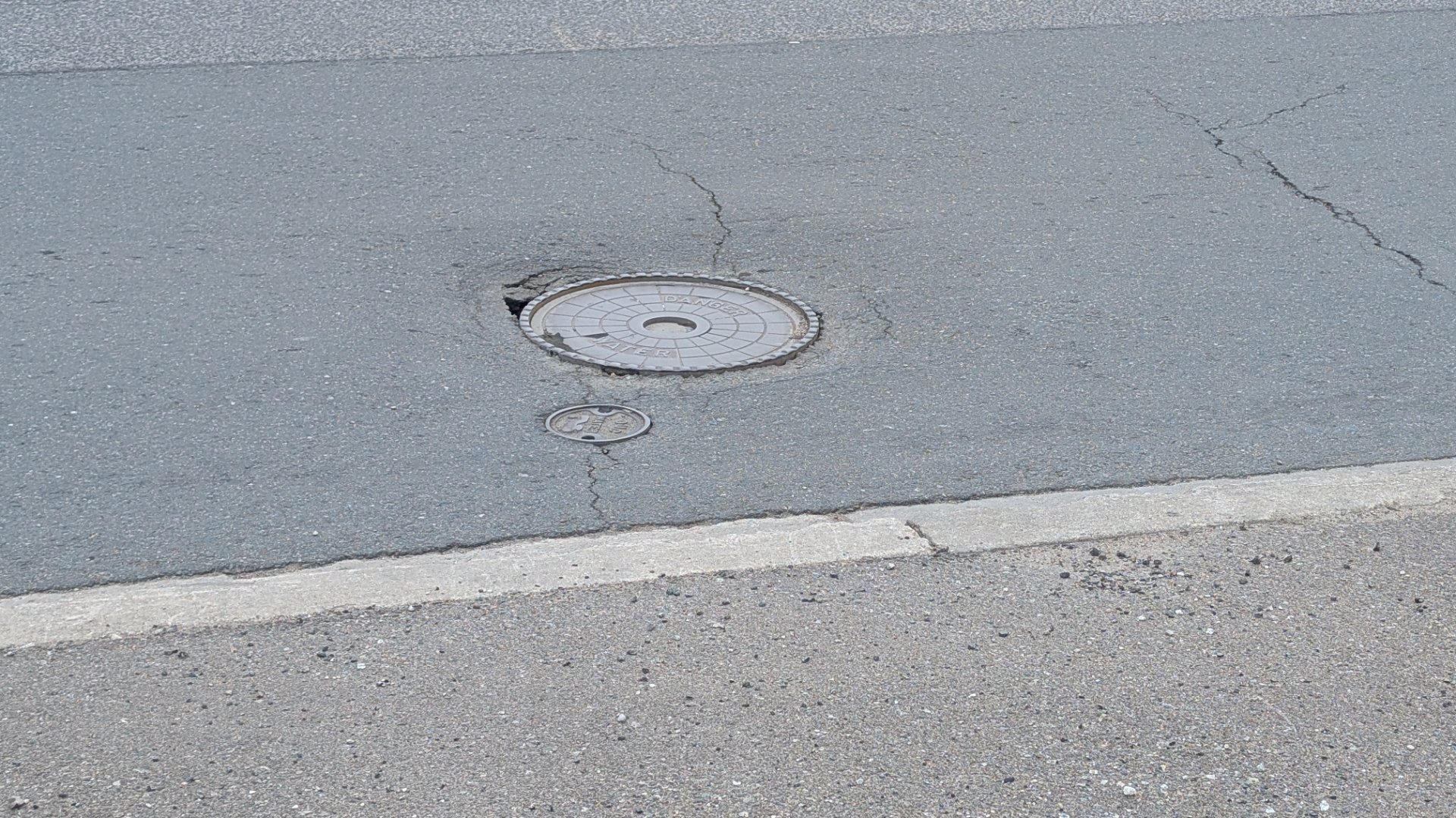 Two utility access covers on Martin Grove Road show visible pavement cracking and subsidence, with radial cracks around the larger catch basin indicating potential drainage system stress or ground settlement. The nearby catch basins in this area average 35 years old.