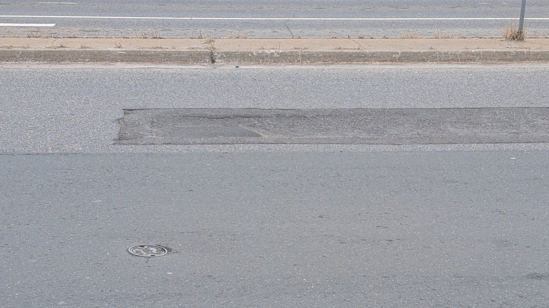 A rectangular sunken asphalt patch approximately 2-3 feet long creates a pothole hazard for cyclists and vehicles on Martin Grove Road. The area has aging catch basin infrastructure installed in 1967.