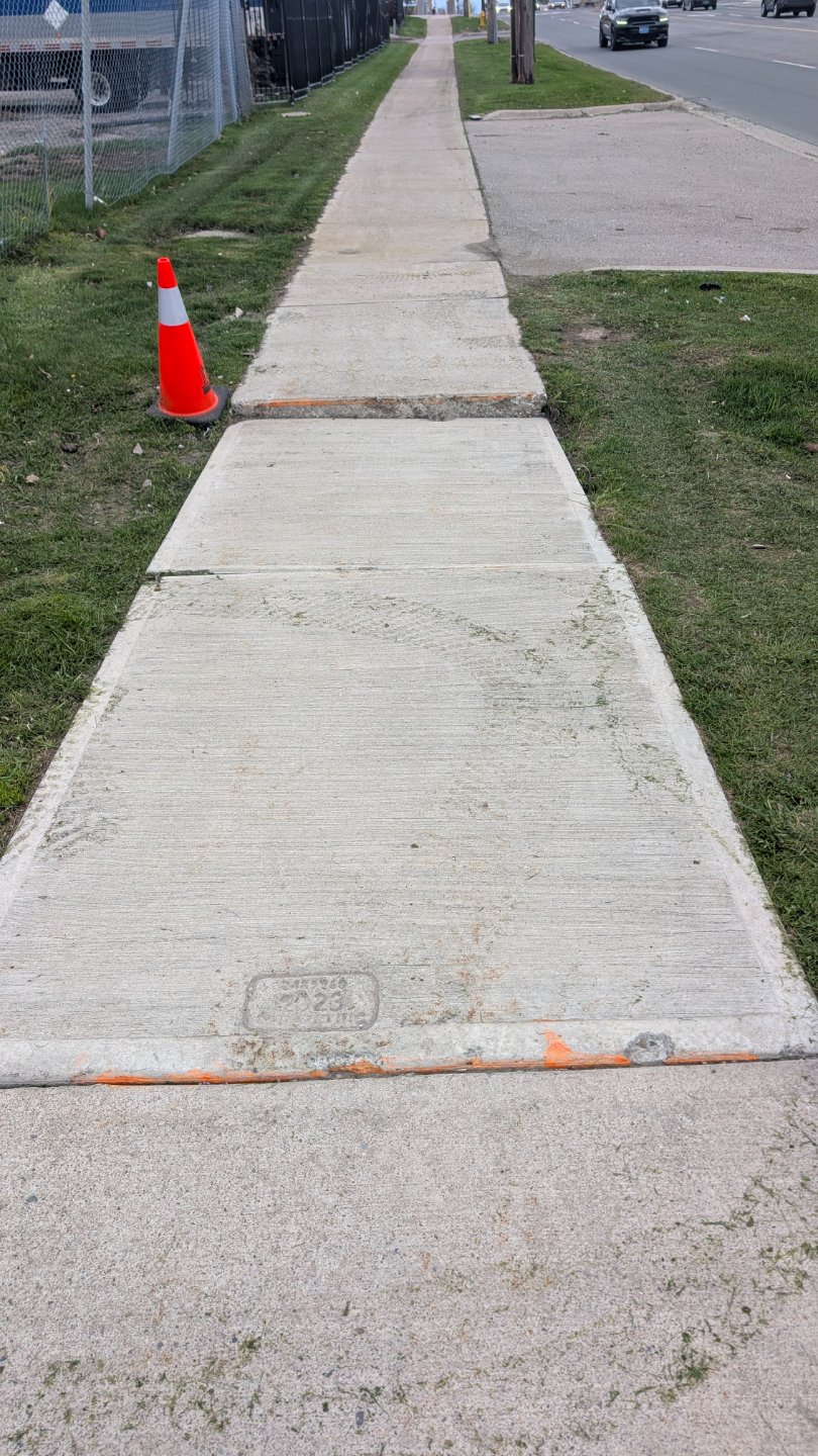 Cracked and heaving concrete sidewalk with multiple raised sections on Martin Grove Road creates trip hazards. Orange paint markings indicate a utility work area with a traffic cone warning pedestrians.