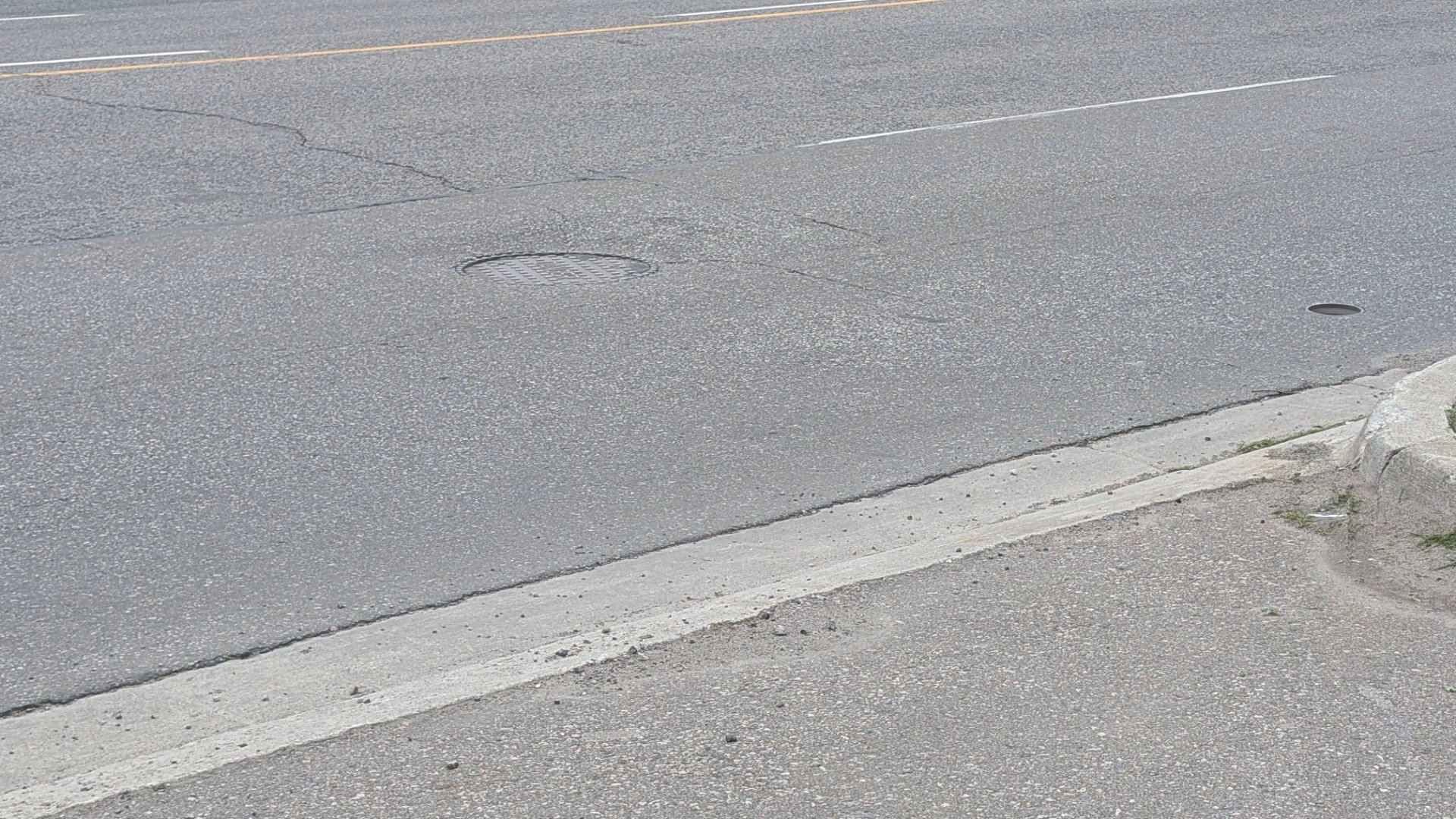 Martin Grove Road has visible cracks and a sunken circular depression in the asphalt that appears to be a settled utility cut patch or catch basin, creating a trip and catch hazard for vehicles and cyclists. The nearby catch basins average 59 years old and may be contributing to surface settlement.