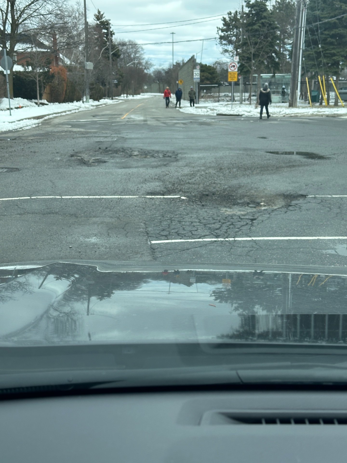 A large pothole on Avenue Road is creating a hazard for vehicles and pedestrians. The damage appears significant and requires urgent repair to prevent further deterioration and potential accidents.