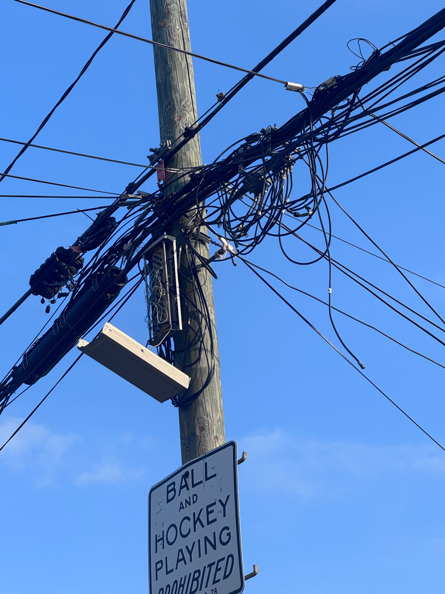 Utility pole at 435 Maybank Avenue has significant tangled wiring, exposed cables, and an open electrical panel cover creating immediate electrical and safety hazards. The messy arrangement of multiple black cables and exposed panel present risks of electrocution and potential structural failure. This requires urgent attention from the utility company to secure cables and properly close the electrical panel.