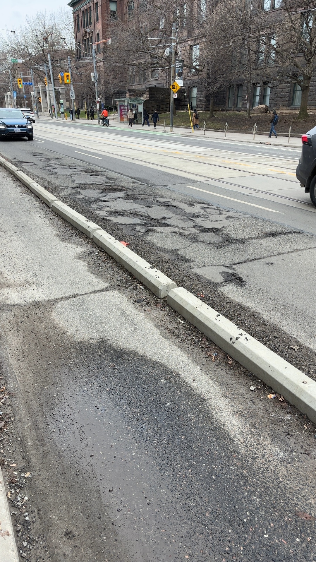The roadway at 148 College Street has sustained medium-level damage requiring repair. The affected pavement shows deterioration that poses a hazard to vehicles and pedestrians in the area.