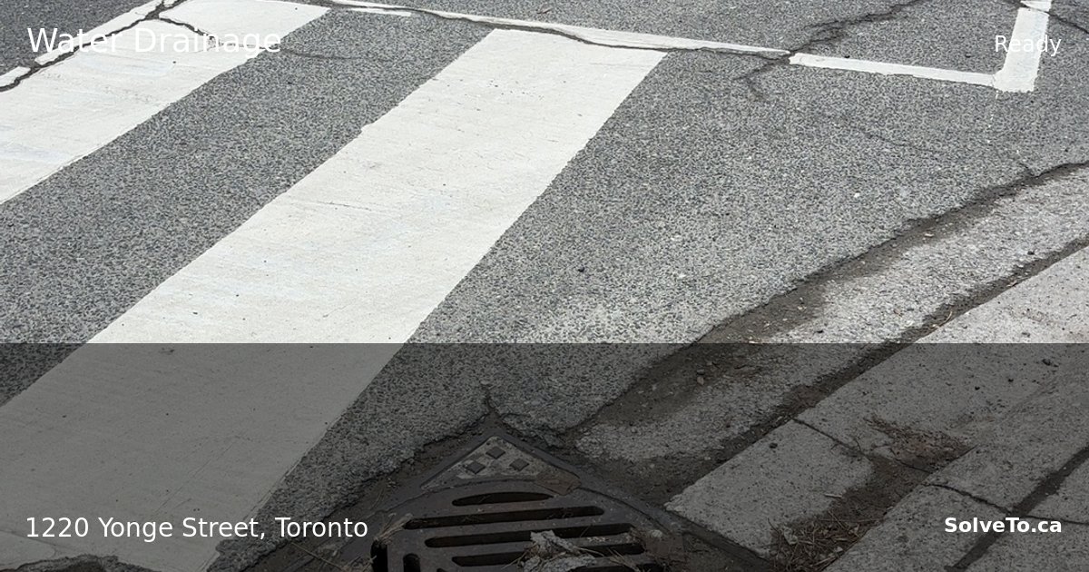 Storm drain at 1220 Yonge Street is completely blocked with debris and sediment accumulation, preventing water drainage and creating a flooding risk during rain. The surrounding pavement is severely deteriorated with deep cracks and heaving, posing a trip hazard for pedestrians and cyclists while compounding the drainage problem.