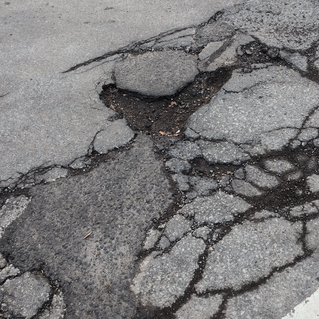 A large pothole approximately 2-3 feet in diameter with exposed aggregate base and crumbling asphalt edges is present at this location. The surrounding pavement shows extensive cracking and spalling, indicating ongoing road deterioration. This creates hazards for pedestrians, cyclists, and vehicles that could suffer suspension or wheel damage.